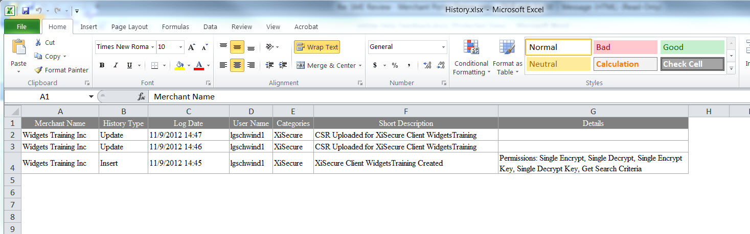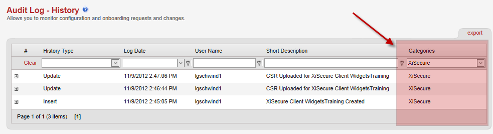 If you click the Change History link from any of the various Merchant Portal pages where available, the Audit Log - History displays with the appropriate Category filter applied. For example, if you are on the XiSecure page and click Change History, you will see audit log entries only related to XiSecure.