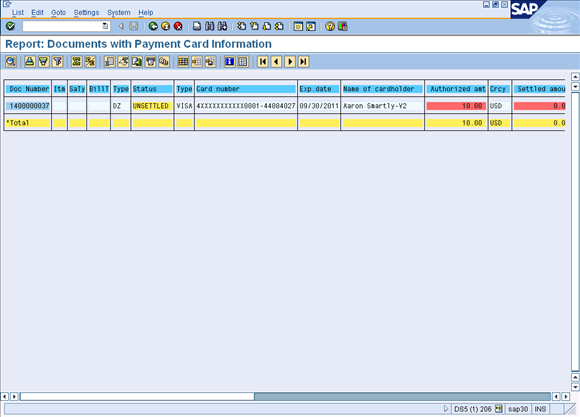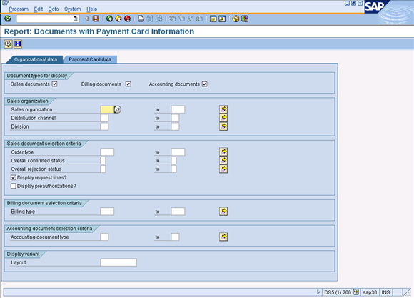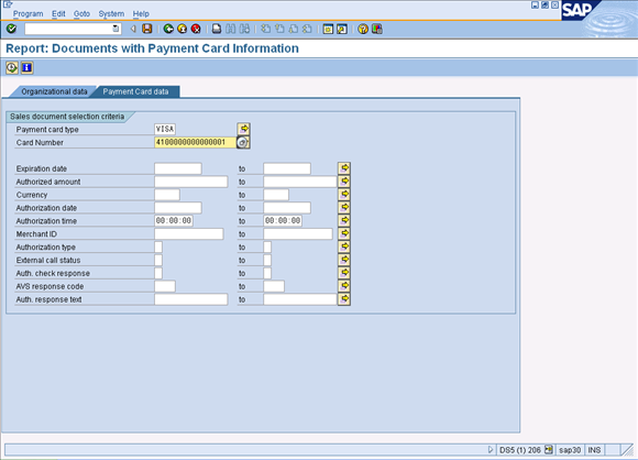 This report will display all order, billing, and accounting documents containing the payment card information entered on the selection screen. This report is useful in quickly finding documents related to a specific card number and can assist in answering customer service questions.