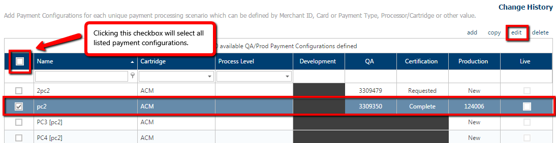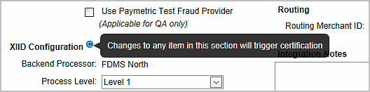 The following procedure provides steps for editing Payment Configurations in XiPay. A 'blue circle 'C' icon beside a section name or field is an indicator that changes in that section/field will trigger a certification. Hover over the icon to display the warning message.
