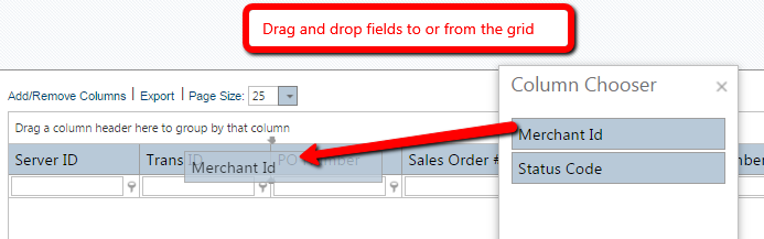 To remove columns from the grid, drag them from the grid to the Field Chooser pop-up.