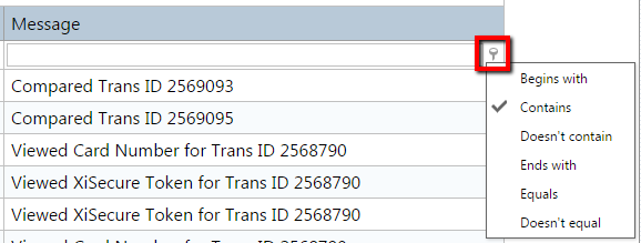 On the desired column, click the Filter icon to choose the filter type. For example, from the Audit Log choose 'Contains' as the filter type for the Message column.