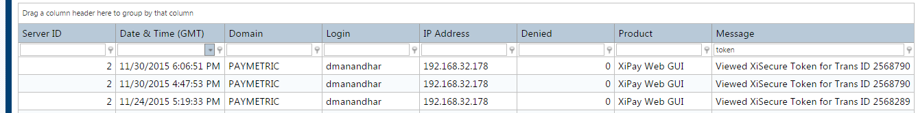 Note that you can apply multiple filters. The filters are cascading. For example, in the Audit Log, you could filter on the Login and then the word Token in the message to further limit the results.