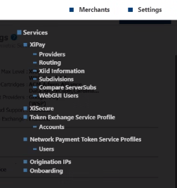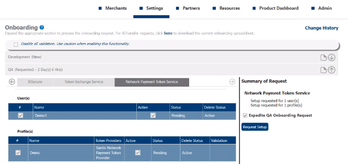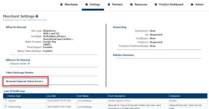 Click next, and then continue onboarding the request. After the Onboarding team enables the Service and Providers in the merchant's profile, menu options display under the Settings menu to create users and configure Network Payment Token Service profiles.