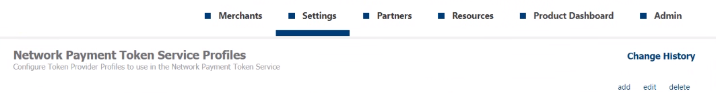 Select Network Payment Token Service Profiles under the Settings menu for the Merchant. You can also access this from the Merchant Settings dashboard.