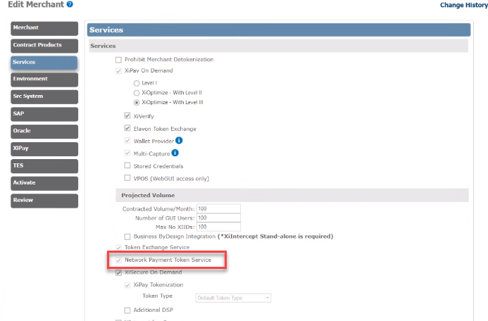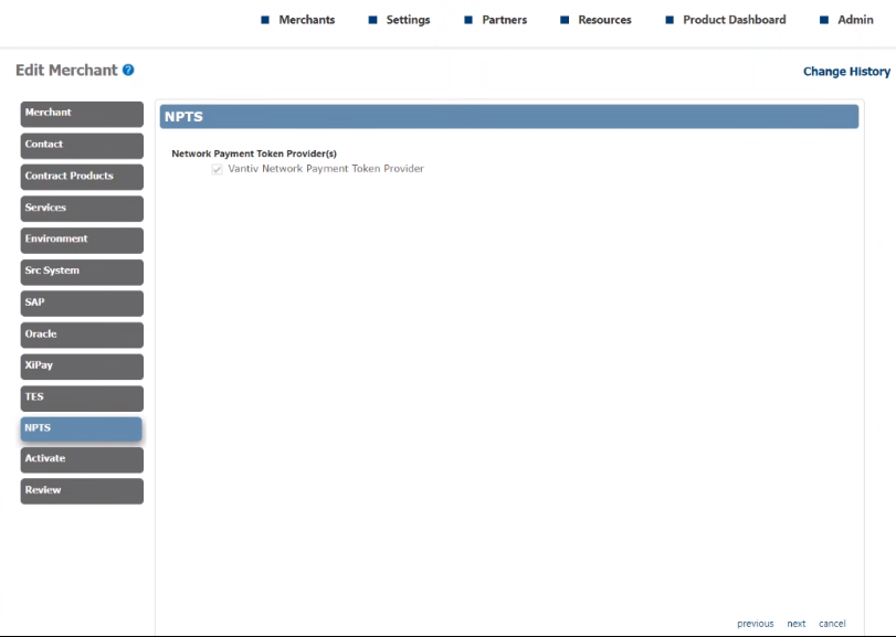 Select the Network Payment Token Service check box. NPTS displays on the left navigation.
