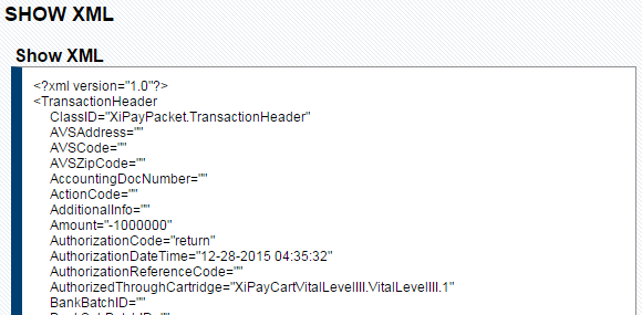 Click the Show XML button to generate an XML report that you can use for troubleshooting. You must have administrative rights to the XiPay server to view the XML output. Show XML provides the full XML data packet that was sent for the transaction.
