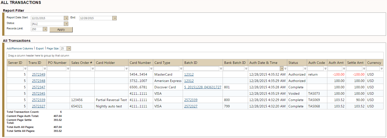 The default sorting for the columns on all pages is by Date/Descending. You can drill down into the transaction information screen by clicking the hyperlinked Transaction ID or Batch ID number.