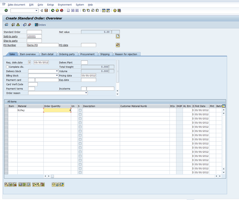 Enter the Sold to party, PO number, Material, and Quantity.