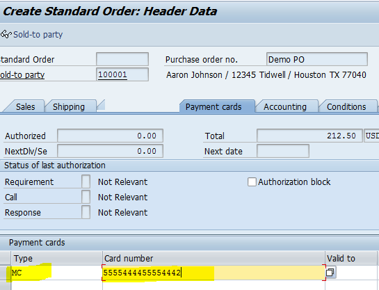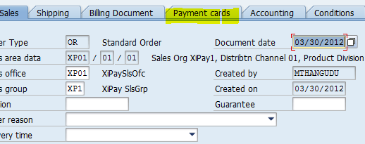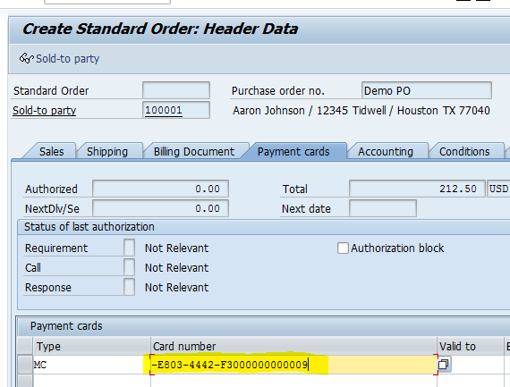 A credit card number is entered on a standard SAP screen (for example on the sales order creation process on the header of the order on the Payment cards tab) and it gets immediately captured and sent to XiSecure On-Demand to retrieve a token. (a pre-existing token if the card was already tokenized or a new token if card is being entered for the first time).