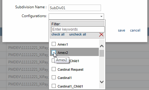Click to Expand XiPay WebGUI users in a subdivision will have access to other payment configurations in the subdivision.