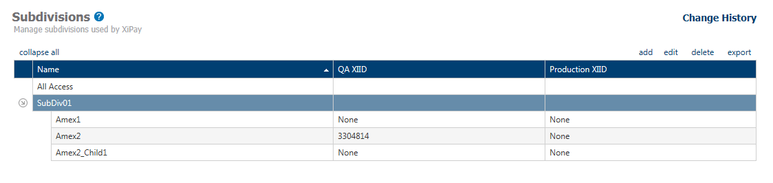 Subdivisions are optional settings that allow you to request logical groupings of XIIDs to which you can assign User permissions. Approving Managers have the ability to add, edit or delete Subdivisions for their assigned merchants.